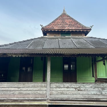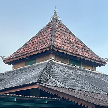 As I observed the roof decorations, I noticed some familiar traditional features and motifs such as ekor itik, sisik ikan, and buah buton, or perhaps kayu tunjuk langit. There were windows beneath the roof to allow ventilation, connected to another layer of roofing made from different materials. This showed that parts of the roof structure had been upgraded and differed from the original design.