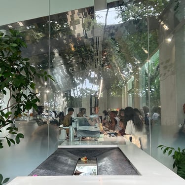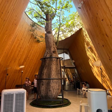 The next morning, we visited Nana Coffee Bangna, a modern cafe located beneath the highways. Beyond serving good coffee, the architecture stood out. The mostly white building separated indoor and outdoor spaces with multiple doors while maintaining visual connection through glass walls. Visitors could sit inside or outside on steel-crafted benches.