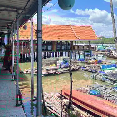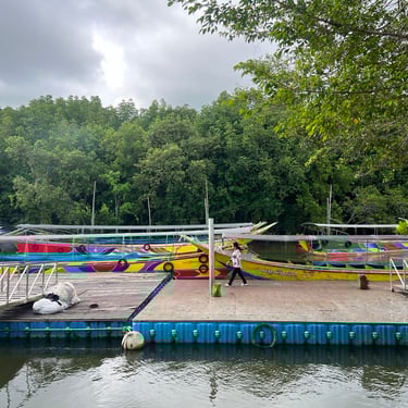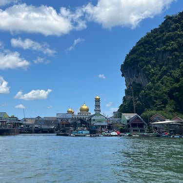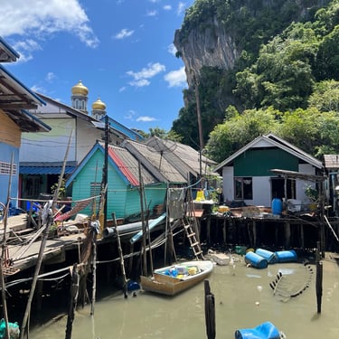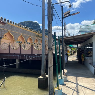 In the afternoon, we headed to Koh Panyee Village, a floating Muslim village, and spent about three hours there. As I approached the village, I saw a golden mosque, timber houses, small jetties, parked sampans, children running, and tourists dining at seafood restaurants. While many sampans were plain, the boats were colourful and vibrant.