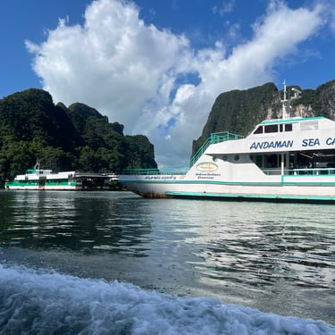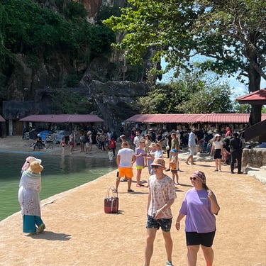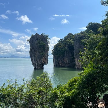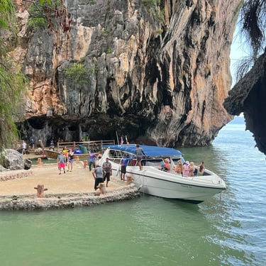 We explored by boat and encountered many Western tourists, some on luxurious yachts, others on long-tail boats. At James Bond Island, there were souvenir shops, swimming area, stalls, and small hills for hiking. Many tourists were swimming and enjoying the scenery freely.