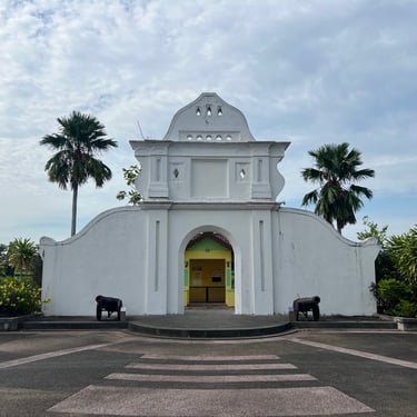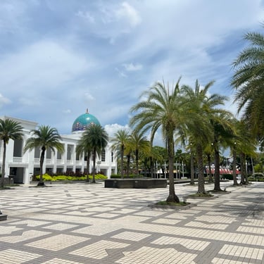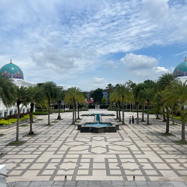The next day, we had no specific destination in mind. We randomly scrolled through interesting spots on Google and decided to visit four landmarks: Kraftangan Alor Setar, Masjid Albukhary, an art gallery, and the state museum. Masjid Albukhary was designed using principles of the Islamic Garden, primarily inspired by Persian geometric patterns. A fountain and palm trees were typical Islamic Garden elements found here. We performed Zohor and Asar prayers before heading to the art gallery.