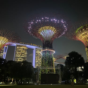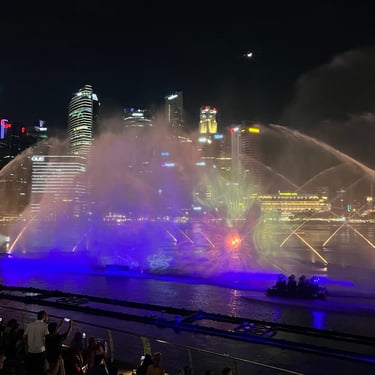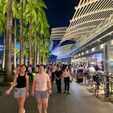 I headed south to visit Marina Bay Sands. I watched the free nightly outdoor light and water show, featuring orchestral soundtracks, striking lighting effects, and fountains, accentuated by Malay, Chinese, and Indian cultural songs. With skyscrapers as the backdrop, the show was wonderful and crowded with tourists. Outside the mall, I saw groups of students practising energetic dances, confidently performing while being encircled by public. The night was enlivened by tourists visiting bars, malls, and enjoying the city view. Later, we stopped at a mamak restaurant for soft drinks before heading to bed. The first night in Singapore felt welcoming and enthralling.