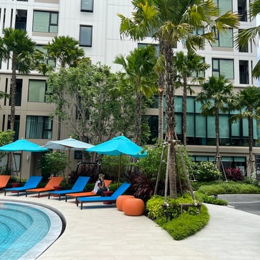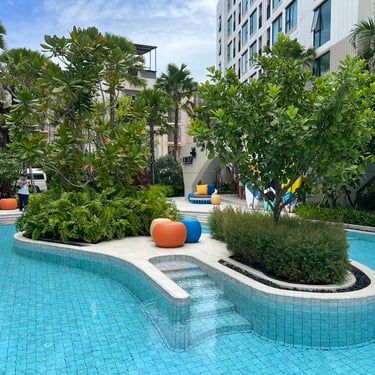 Before lunch, I managed to tour Kave COCO Bangsaen, a landscape project for a condominium located on the outskirts of the city. The design was colourful and organic, deserving credit to the landscape architect and contractors who successfully created such a fluid and natural form around the swimming pool area. The space evoked a beach-like vibe, complete with a man-made island in the pool and comfortable seating areas perfect for relaxation.