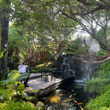 After lunch, before ending the second day of the trip, we visited Harudot Chonburi Coffee. I can confidently say that such an impressive cafe is hard to find, even in Kuala Lumpur. With a generous budget, the owner showcased a passion for art and architecture through a stunning design that blended indoor and outdoor spaces. I was totally deeply moved by the immaculate design. The outdoor area was therapeutic, occupied by a natural forest, surrounded by lush plants, gentle water sprays, and the soothing sounds of birds and waterfalls. With its calming atmosphere and reasonable prices, it is a perfect spot for Gen Z to enjoy desserts while reconciling with nature.